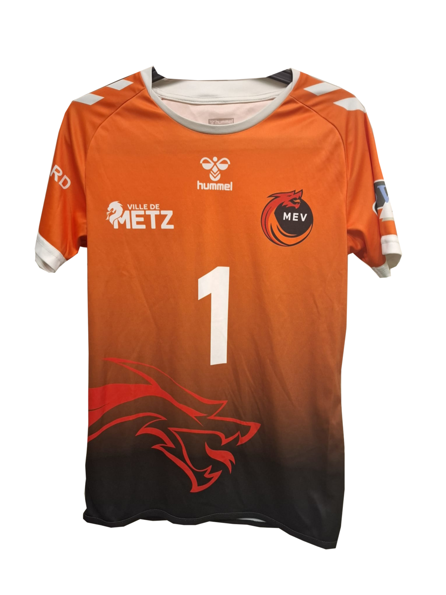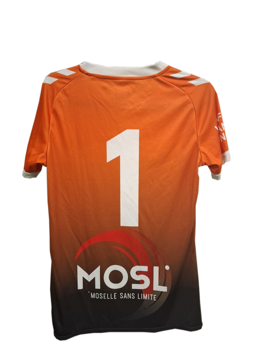 Maillot sublimé de marque HUMMEL de couleur orange et noir avec écusson du club et numéros.